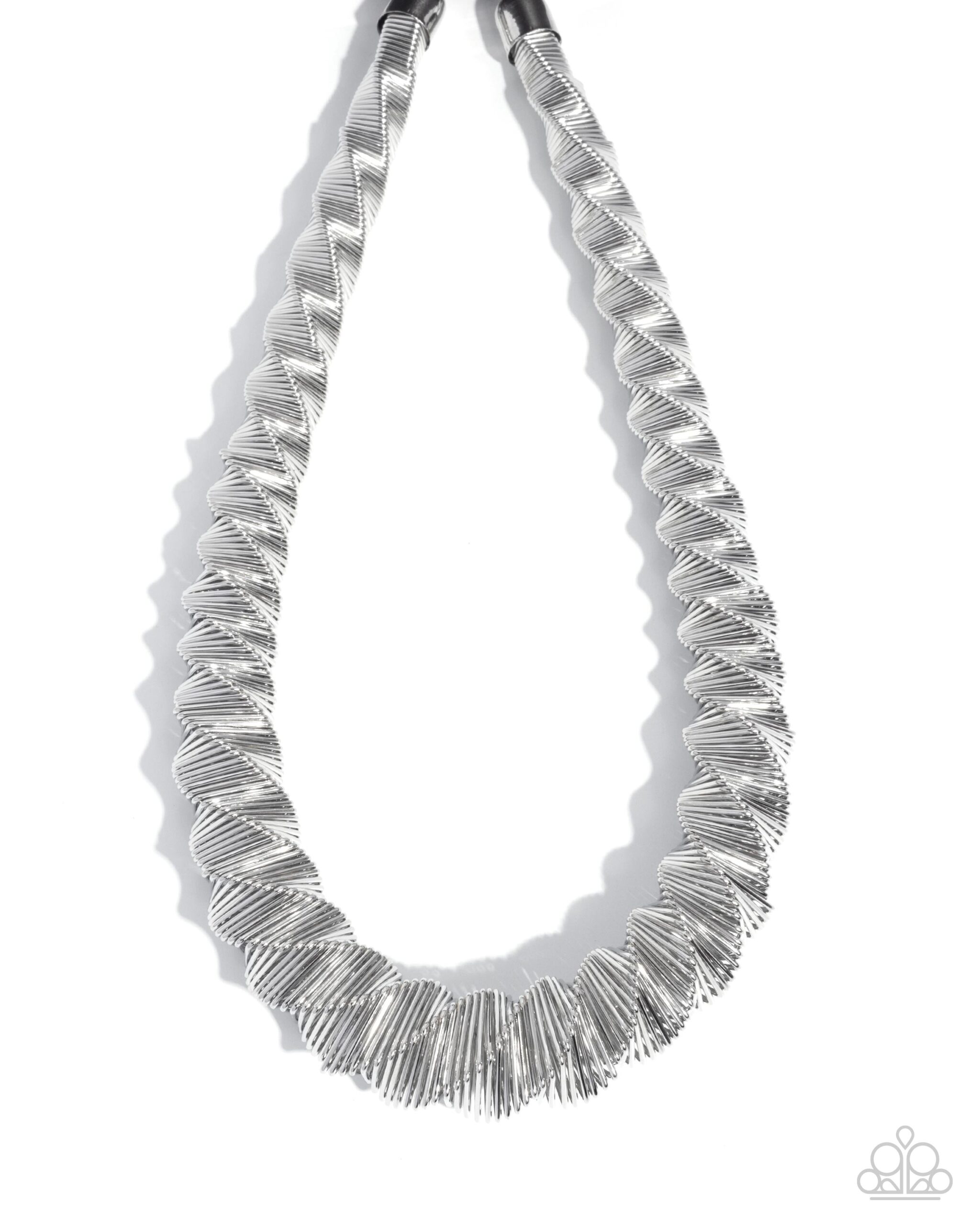 Dainty tactile linear silver bars curl and coil along the neckline in sections for a light-reflecting luminescent display. Features an adjustable clasp closure.